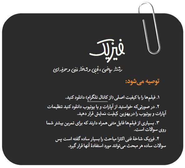 چنانچه شما میخواهید آموزش مفصل مباحث فیزیک را ببینید میتوانید به صفحۀ رشتۀ تحصیلیتان مراجعه کنید. همچنین میتوانید به صفحۀ فیزیک سایت مراجعه کنید. فیلمهایی که در این صفحه میبینید مدت زمان پانزده دقیقهای دارند و با چند تمرین به مروری روی مبحثها پرداخته است.