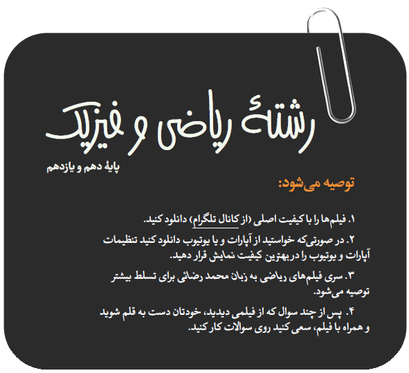 حتما فیلمها را به اینصورت ببینید تا بیشترین تاثیر را تجربه کنید. فیلم هر مبحث و فایل متنی – در صورت وجود – را دانلود کنید علاوه بر اینجا در کانال تلگرامی هم فیلمها به صورت منظم قرار دارد. (t.me/barpafile ) ابتدا فیلم یا یکبار از ابتدا تا انتها ببینید تا یک دید کلی از مفاهیم و حل مسائل پیدا کنید. در سوالات ابتدائی سعی کنید بفهمید و در سوالات و مثالهای بعدی چنانچه دست به قلم ببرید خوب است. در بارهای بعدی سوال به سوال پیش بروید، یعنی صورت سوال را دیدید، فیلم را نگه دارید و سعی کنید خودتان روی کاغذ حل کنید، اگر درست حل کردید بروید سراغ بعدی و الا روی همان سوال متمرکز شوید.